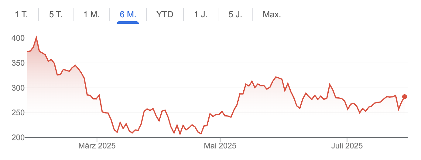 Die Reaktion des Marktes auf die Quartalszahlen war eindeutig: -8 % in einem Tag. Ein Bruch wichtiger Unterstützungen, ein RSI von unter 30, ein MACD im tiefroten Bereich – und ein „Death Cross“, das sich gefährlich nähert. Große Investoren scheinen das Vertrauen verloren zu haben – der Abverkauf war von enormem Volumen begleitet.